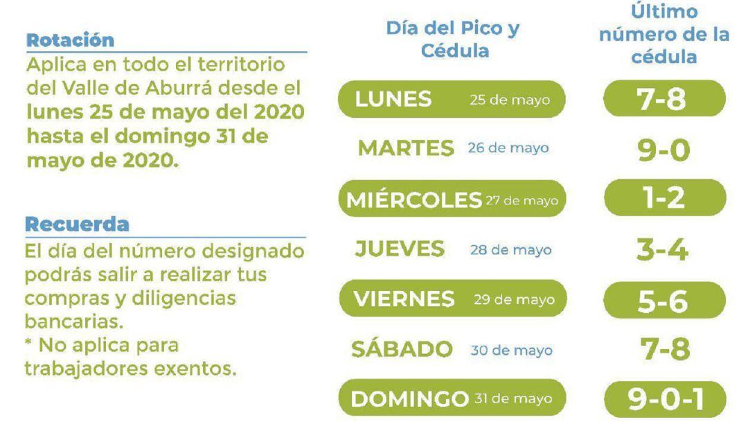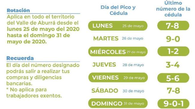 Los 10 alcaldes que hacen parte del Valle de Aburrá acordaron continuar con la medida de pico y cédula unificada, la medida que busca regular la circulación de personas durante la cuarentena obligatoria regirá desde este lunes 25 de mayo y hasta el 31 del mismo mes, hasta cuando se extendió el aislamiento social decretado por el presidente de la república.