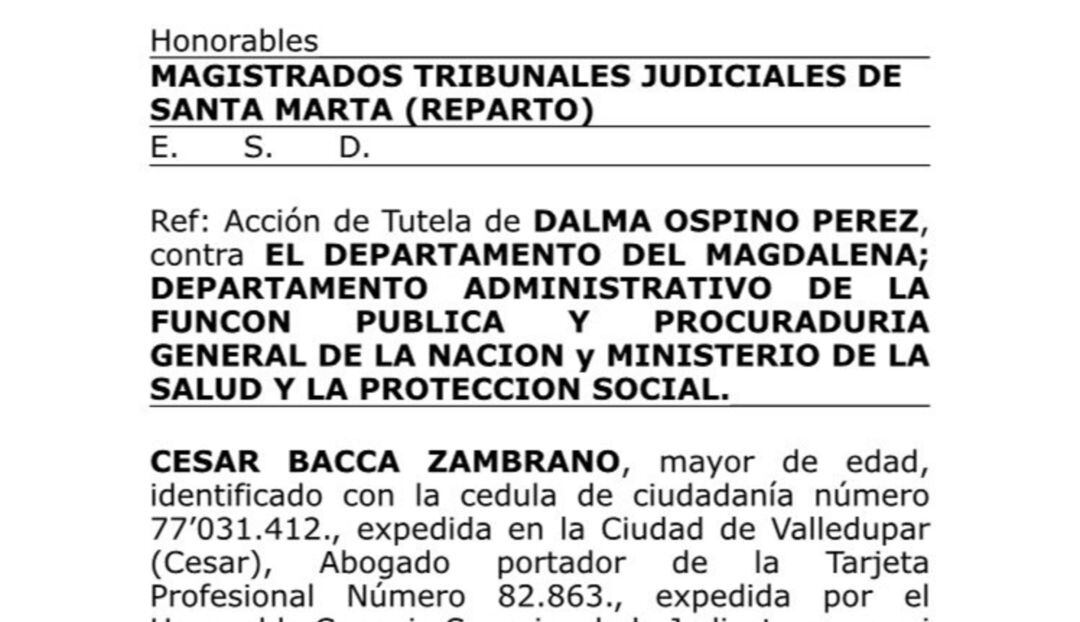 En el Juzgado Segundo Penal Especializado del Circuito de Santa Marta, se encuentra en trámite la acción de tutela instaurada por Dalma Ospino Pérez contra la Gobernación del Magdalena.