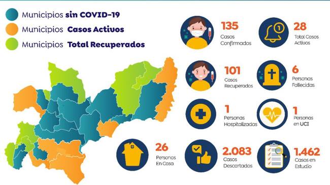Con este registro, ya son 135 casos positivos por COVID-19 que se han presentado en Caldas, de ellos 101 personas ya se han recuperado y aún permanecen 28 casos activos en seis municipios y se mantiene en seis la cifra de personas fallecidas.