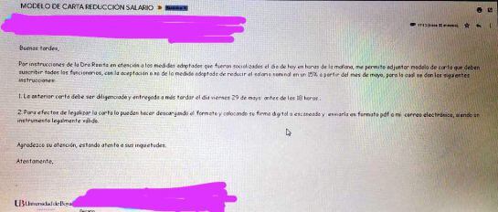 En el correo que se rota para los funcionarios de la universidad privada, en cuyo asunto se titula: MODELO DE CARTA REDUCCIÓN DE SALARIO, al parecer un Decano de uno de los programas de la universidad, es quien envía la plantilla de la misiva para que los trabajadores la firmen, para efectos de que sea legalizada la supuesta reducción del salario.