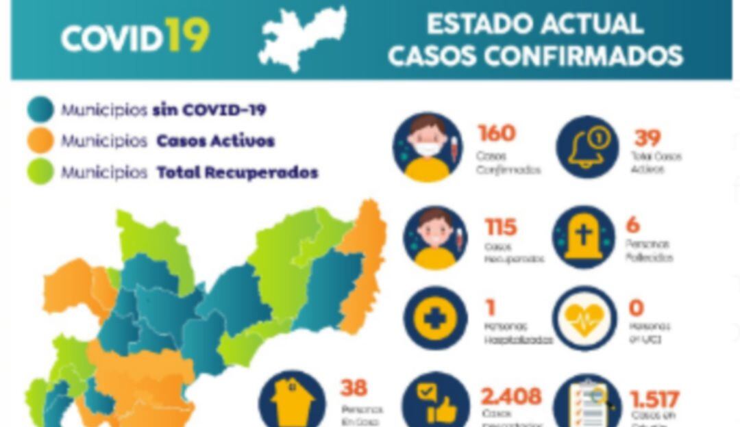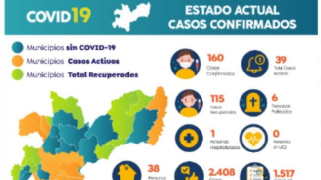 El total de casos activos son 39, ya que de los 160 se han recuperado 115 y han fallecido seis personas.