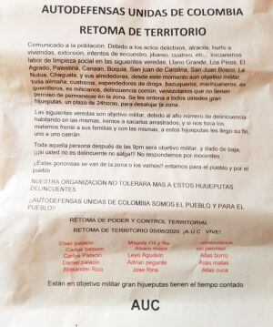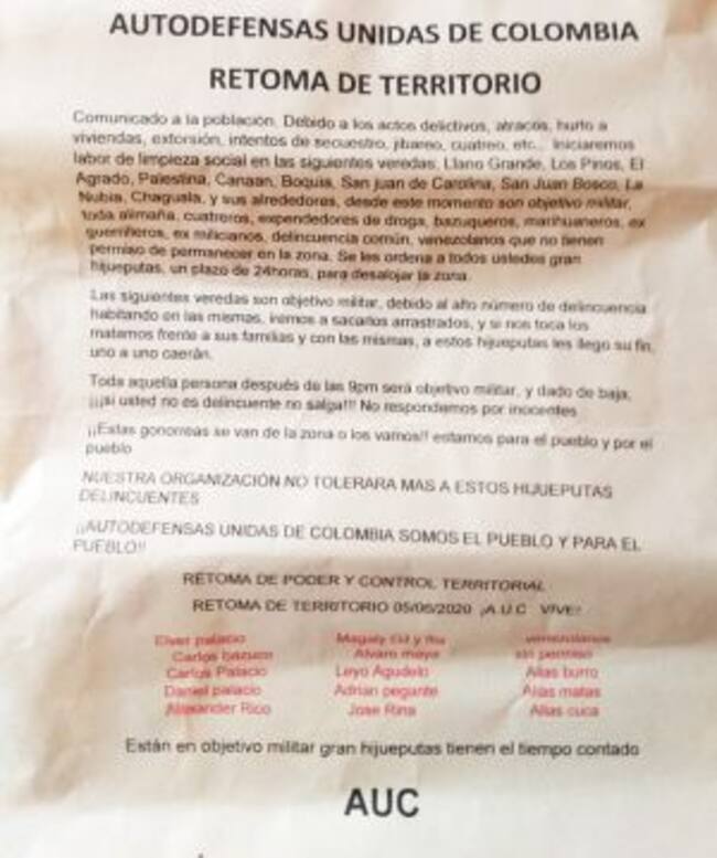 Con el título “Autodefensas Unidas de Colombia Retoma el territorio” apareció un panfleto durante el fin de semana en al menos 10 veredas del municipio de Salento en el Quindío donde anuncian limpieza social por el incremento en la delincuencia.