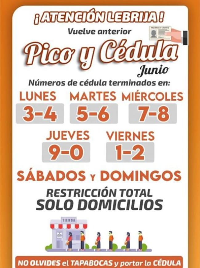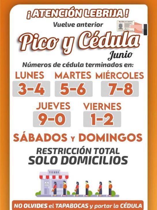 Lebrija era uno de los municipios que se había acogido a la medida de pico y cédula par e impar al igual que los cuatro municipios del área metropolitana y Barrancabermeja, tras la visita del ministro de comercio, José Manuel Restrepo.