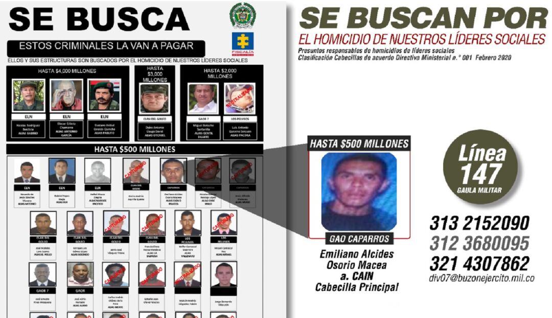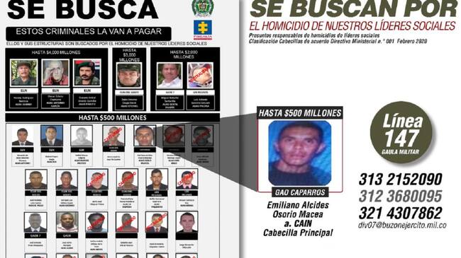 “Se ha elevado la recompensa hasta 500 millones de pesos para quien nos dé información para lograr la captura de este bandido y neutralizar sus intenciones que es atacar la población civil”, detalló el Mayor General Juan Carlos Ramírez, comandante de la Séptima División del Ejército.