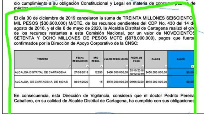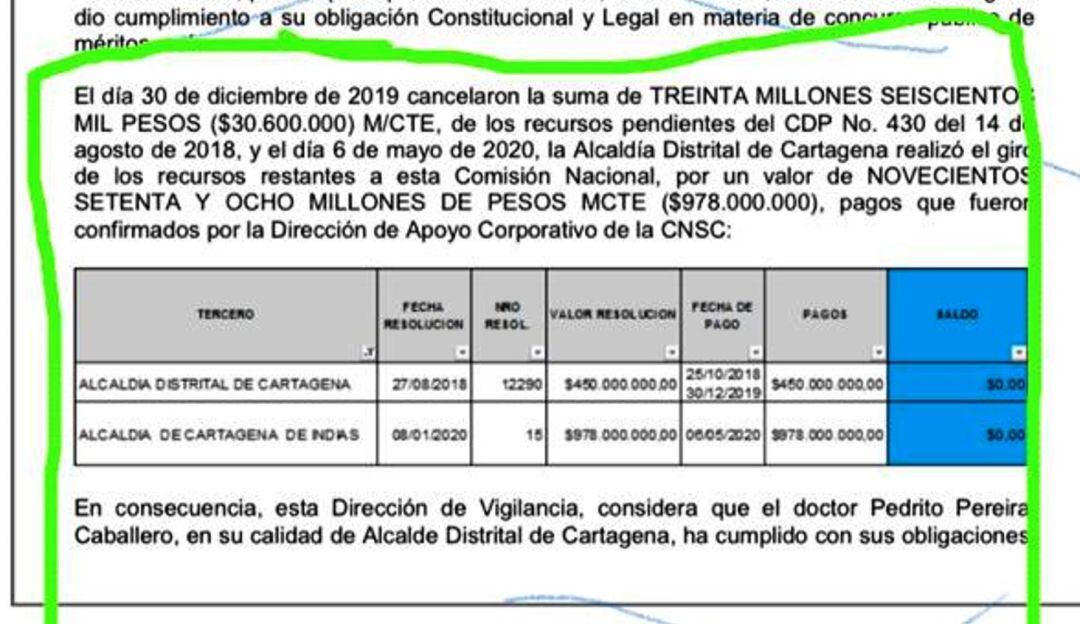 “Envío la resolución 6411 del 2020 de la Comisión Nacional del Servicio Civil donde aclara que en el 2019 la alcaldía de Cartagena cumplió todos sus compromisos con la Comisión Nacional del Servicio Civil y reporta los pagos que pudimos hacer entre 2018 y 2019, de acuerdo a las necesidades presupuestales que teníamos y las condiciones en que nos encontrábamos por la multitud de embargos del último trimestre del año, los cuales fueron divulgados oportunamente, sin embargo, mediante esta resolución que se le había abierto investigación a la Alcaldía de Cartagena queda claramente demostrado que lo que nos correspondió hacer con la Comisión De Nacional Del Servicio Civil fue completamente realizado como lo demuestra esta resolución de hace unos días donde se nos archiva la investigación y declara textualmente que nuestra administración cumplió lo que le correspondía en la parte económica y de gestión con la Comisión Nacional del Servicio Civil.”