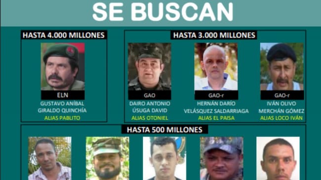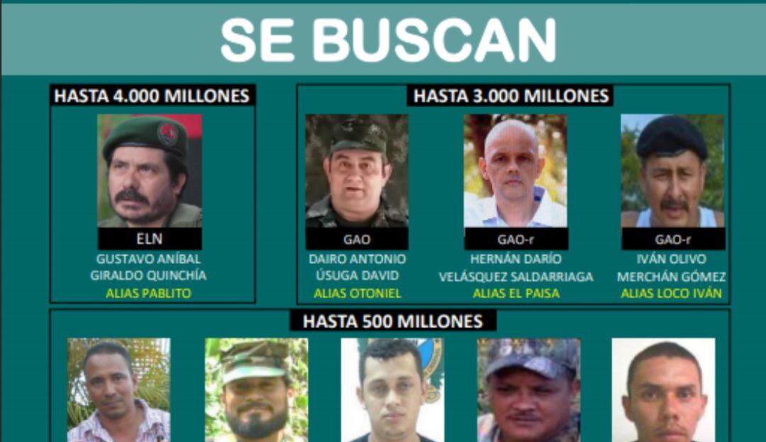 Hasta cuatro mil millones de pesos ofrece la Policía Nacional a quienes brinden información de los 10 hombres más buscados en todo el país.En su cartel público, las autoridades afirman que algunos de estos pertenecen al ELN y también a otros grupos armados organizados.