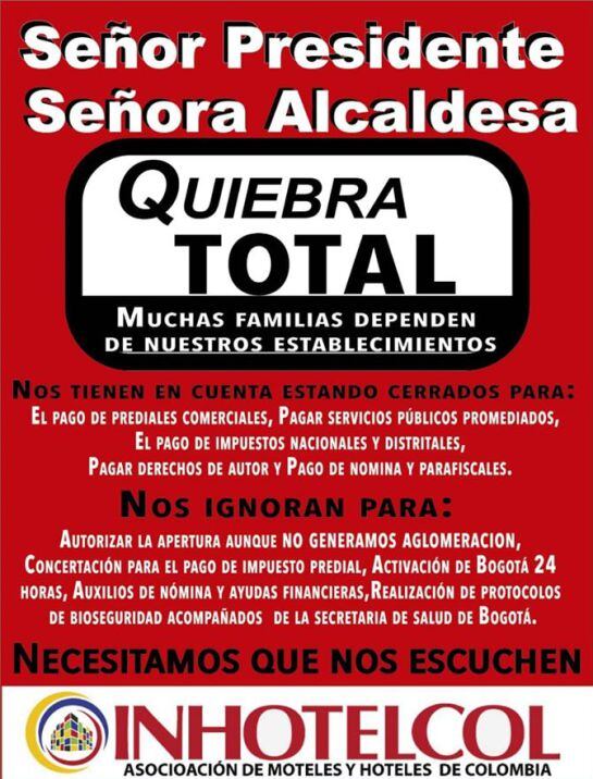 En uno de los carteles que tienen estos comercios se lee: "Señor presidente, señora alcaldesa, quiebra total. Muchas familias dependen de nuestros establecimientos. Nos tienen en cuenta que estamos cerrados para el pago de prediales comerciales, de servicios promediados, de impuestos nacionales y distritales. Además, cancelar los derechos de autor y realizar el pago de nominas y parafiscales".