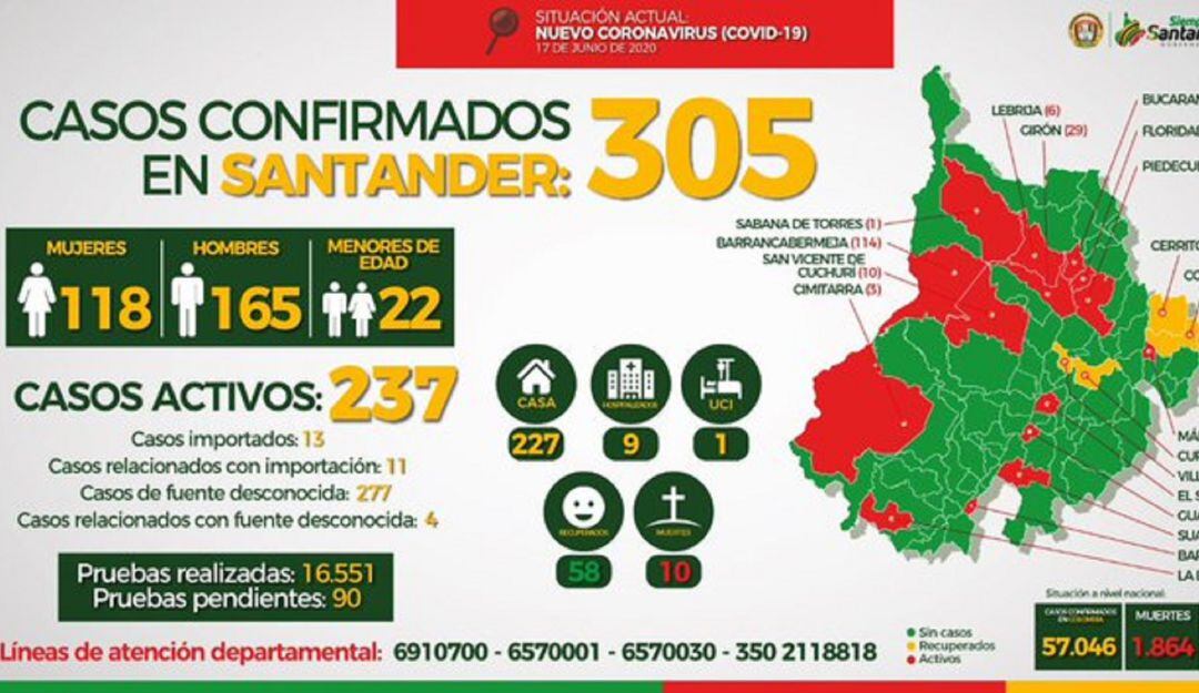 Santander entonces tiene 305 casos, de los cuales 237 están activos, 58 recuperados y 10 fallecidos.