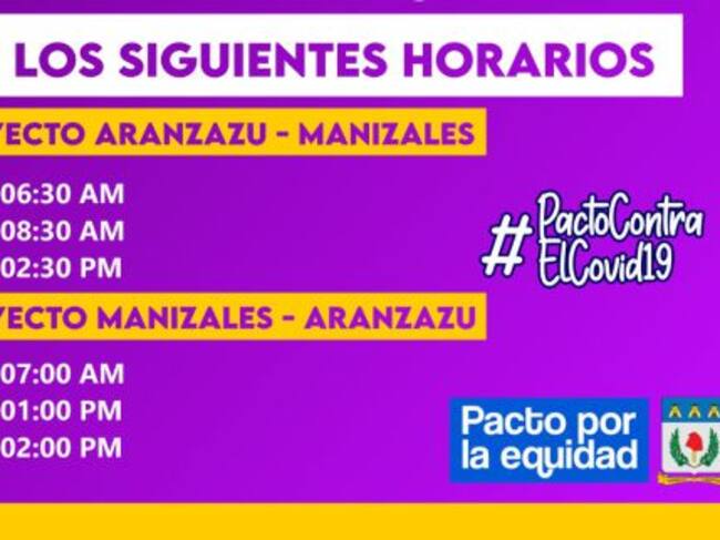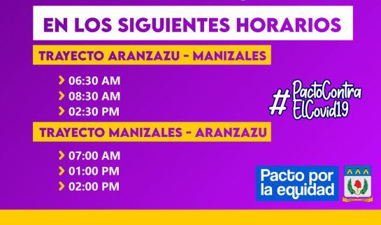Desde la Alcaldía de Aranzazu informan a la comunidad que a partir del jueves 18 de junio estará habilitado el transporte de pasajeros, para trasladarse desde la localidad hasta la capital caldense.