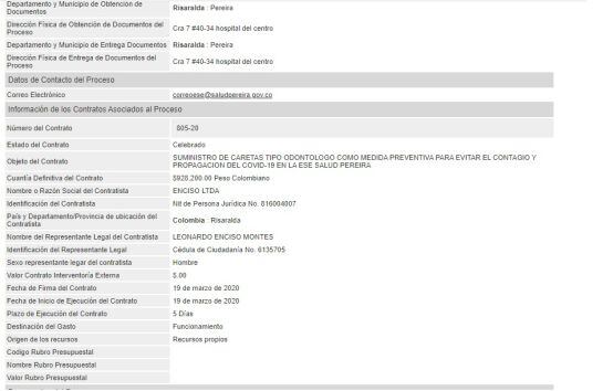 “Los contratos aparecen firmados por el señor Leonardo Enciso Montes, quien aparece entregando dinero a alguna campaña en Risaralda por un valor de 5 millones de pesos; fueron suscritos para la compraventa de insumos médicos y suministro de caretas de tipo especial odontológico, con destino a la ESE Salud Pereira y el Aeropuerto Internacional Matecaña”, dijo Fonseca.