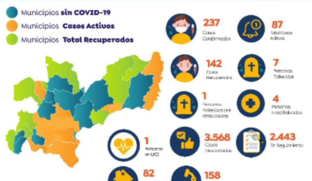 De las 237 personas que han dado positivo en Caldas, se han recuperado 142, han fallecido 7 y 87 todavía continúan con la enfermedad activa.