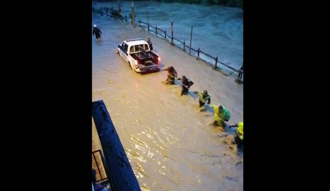 Una camioneta de la policía que estaba cerca al fluente cuando este se desbordó tuvo que ser rescatada y halada por varias personas con un lazo.