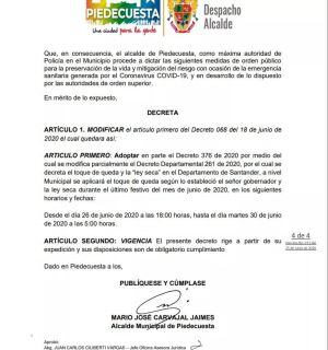 El toque de queda en Piedecuesta si quedó igual al del resto del departamento que inicia desde mañana sábado a las 6:00 de la tarde hasta las 5:00 de la mañana del martes.