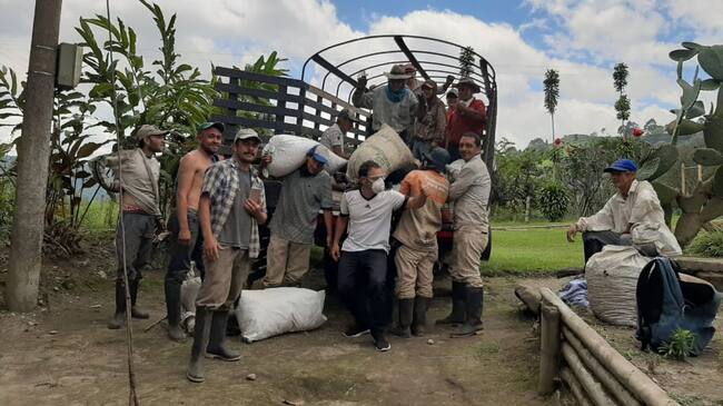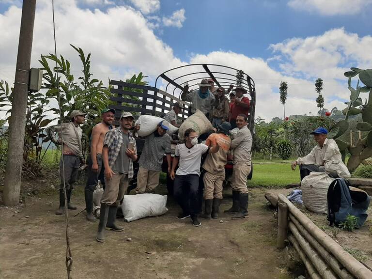Los recolectores cargando los bultos de café en finca de Circasia, Quindío