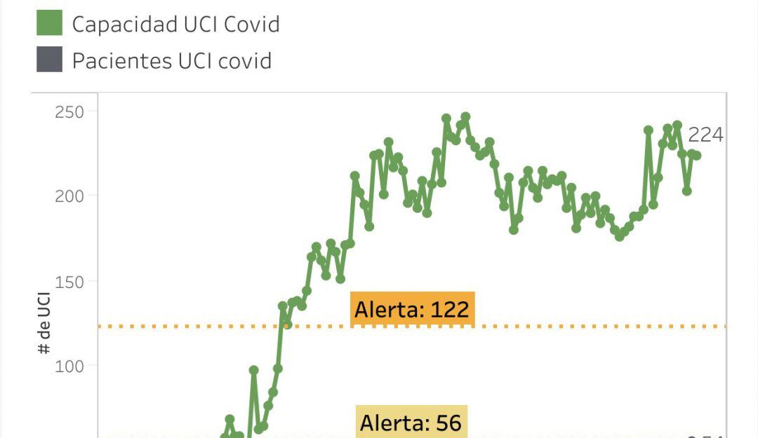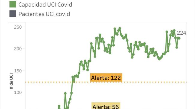 Confirmó el alcalde que la ciudad está a dos puntos de decretar la alerta amarilla si se tiene en cuenta que Medellín cuenta con 224 camas UCI, de estas 54 están ocupadas y cuando sean ocupadas 56 se decretará la alerta.