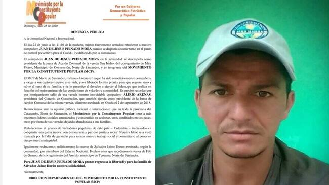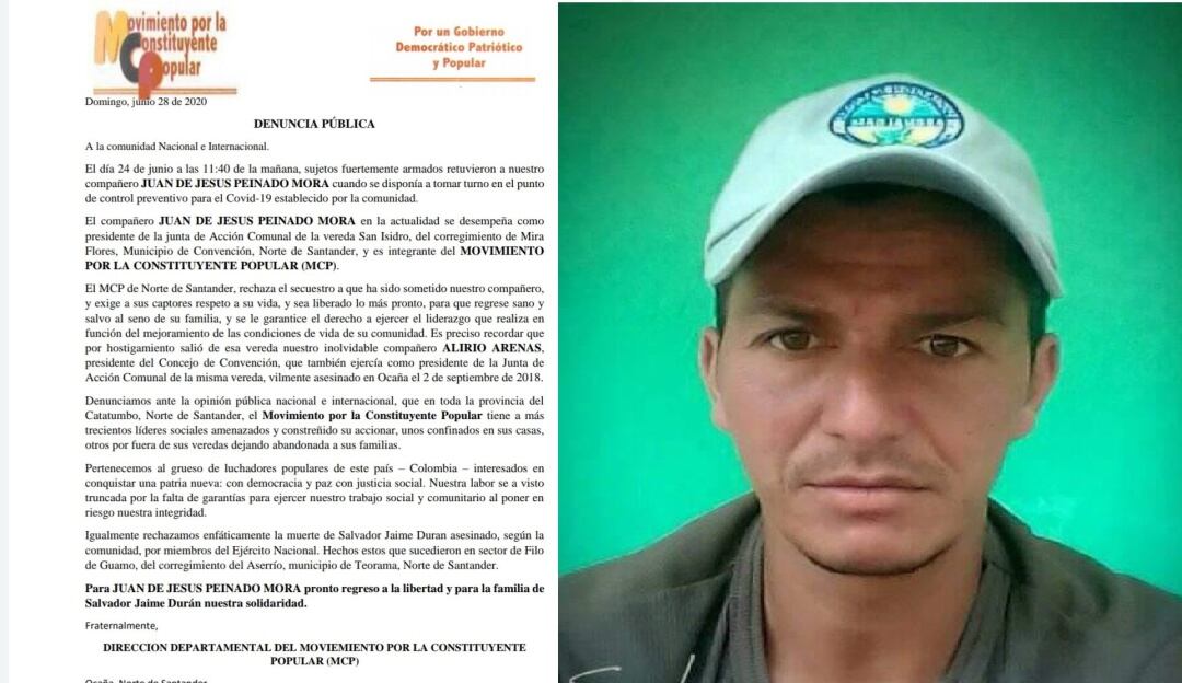 La comunidad en el municipio de Convención en Norte de Santander reportó el secuestro en las últimas horas del líder comunal Juan de Jesús Peinado Mora, el cual se disponía a tomar turno en el puesto de control instalado en la entrada del municipio para el control del contagio del Coronavirus en la zona del Catatumbo.