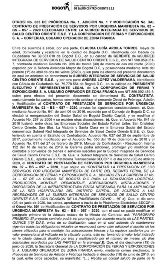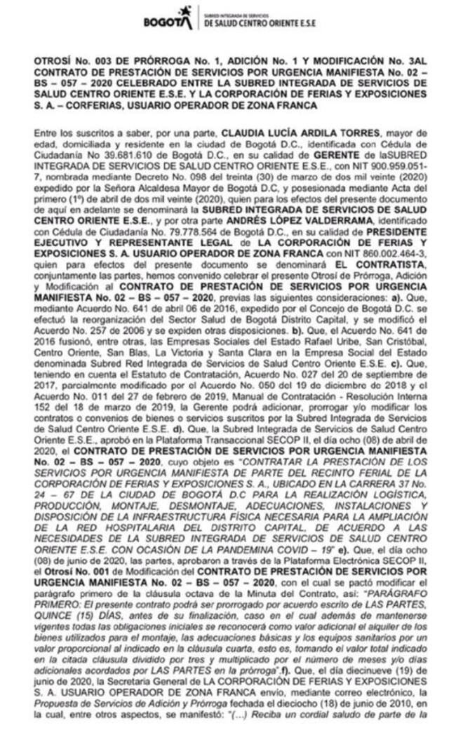 La Subred Integrada de Servicios de Salud Centro Oriente dio a conocer la prórroga por un mes y 23 días del contrato de prestación de servicios en el hospital transitorio de Corferias.