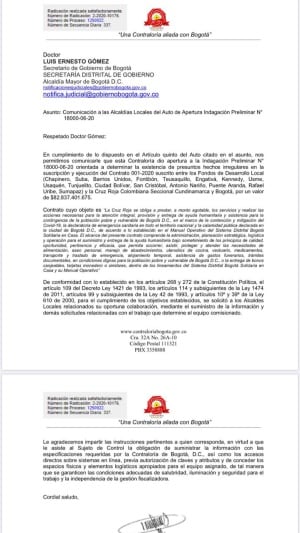 En un documento enviado desde la Contraloría de Bogotá al secretario de Gobierno, Luis Ernesto Gómez, el ente de Control le informa de la apertura de indagación a los Fondos de Desarrollo Local de 16 de las 20 localidades de la ciudad, esto por contratos firmados en el marco de la emergencia por el COVID 19.