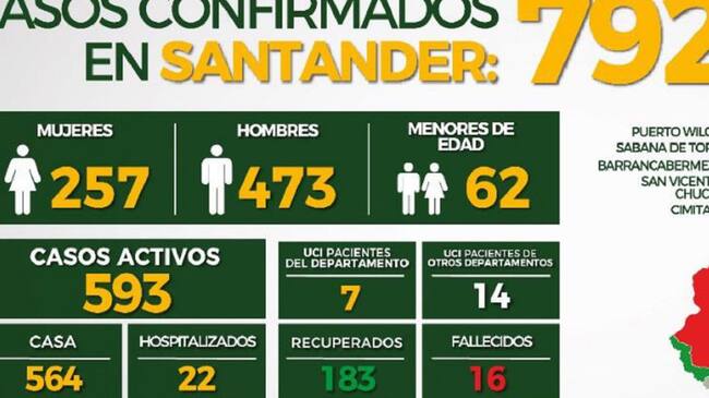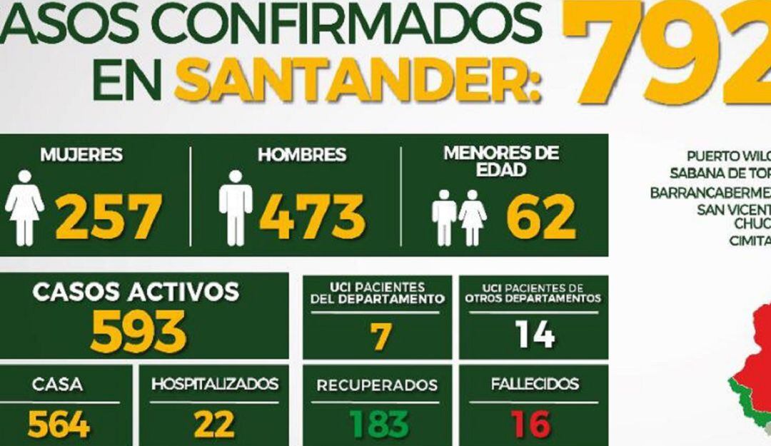 Para un total de 792 casos en Santander, de los cuales 593 están activos, 183 recuperados y 16 fallecidos.
