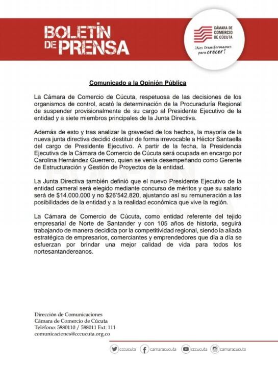 Al conocer la decisión de la Procuraduría Regional la Cámara de Comercio se declaró respetuosa de las acciones adelantadas por el Ministerio Público y mediante un comunicado explico su situación actual.