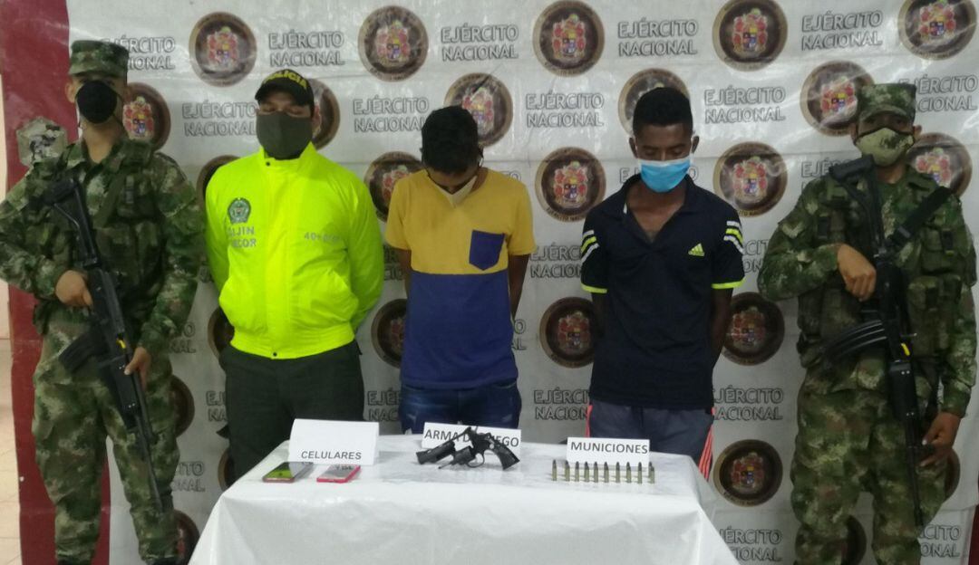 En otro punto del municipio de Montelíbano dos sujetos que responden a los alias de Kiko (Andrés Felipe Puentes Urango) y (Moisés esteban Hernández Torres) fueron sorprendidos por las tropas con un revolver calibre 38mm, 20 cartuchos calibre 38 mm y dos celulares.