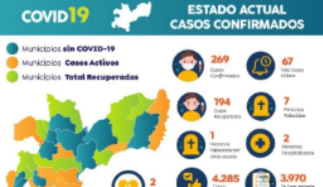 Sobre los casos recuperados, la entidad indica que son actualmente 194, manifiesta además que en total han fallecido 7 personas por el virus y que 67 están activos, de estos últimos, 63 personas están aislados en sus casas, dos están en UCI, y las otras dos se encuentran hospitalizadas.
