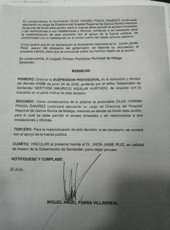 Tras estos hechos, la funcionaria fue relevada por otro gerente quien ni siquiera alcanzó a llegar a su oficina en el hospital porque el Juzgado Primero Promiscuo Municipal ordenó la suspensión provisional de la aplicación y el decreto 04 286 proferido por el mandatario departamental para admitir la renuncia de la gerente Prada Ramírez.