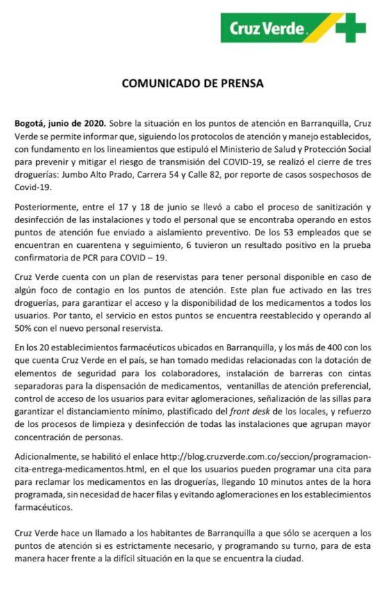 En un comunicado de prensa, Cruz Verde señaló que varias de tres de sus sedes debieron ser cerradas por sospecha de COVID-19 en algunos de sus empleados por lo que se les ha pedido a sus usuarios asistir a la sede mencionada. "De los 53 empleados que se encuentran en cuarentena y seguimiento, 6 tuvieron un resultado positivo en la prueba confirmatoria de PCR para COVID-19", expresa el documento.