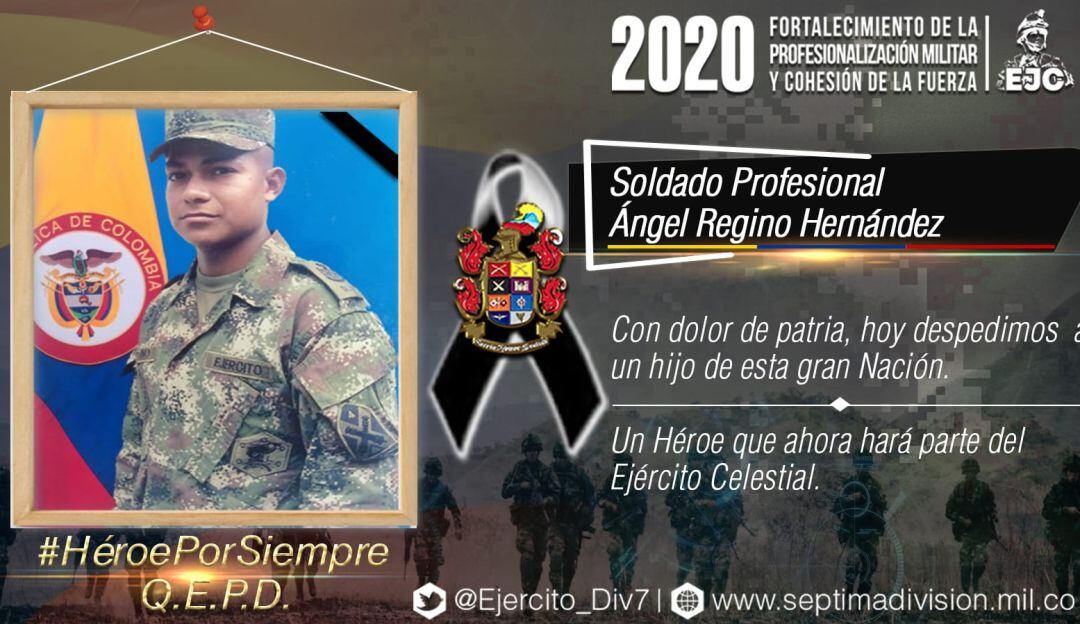 El soldado fue identificado como Regino Hernández Ángel, oriundo del municipio de Necoclí, en el Urabá de Antioquia, quien protegía a las comunidades que habitan en esta subregión del departamento.