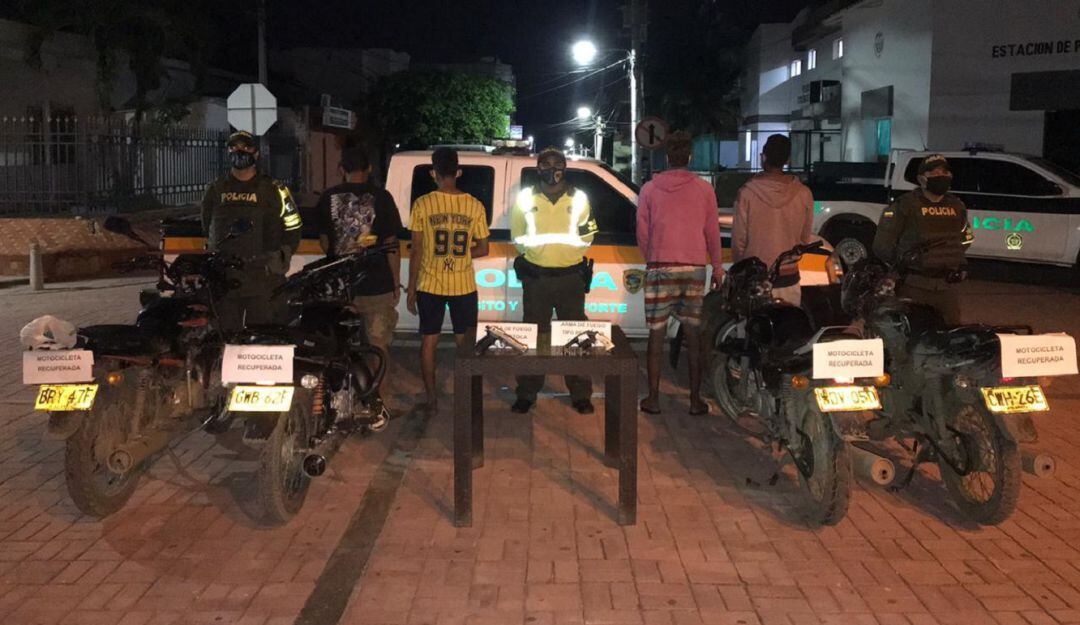 En el procedimiento, los policías incautaron de un revólver marca smith wesson calibre 38, una pistola sin marcas calibre 9 milímetros que portaban los presuntos atracadores. Así mismo, se inmovilizaron una motocicleta y recuperaron dos de placas BRY47F- GWB 62F marca Auteco, las cuales habían hurtadas minutos antes.