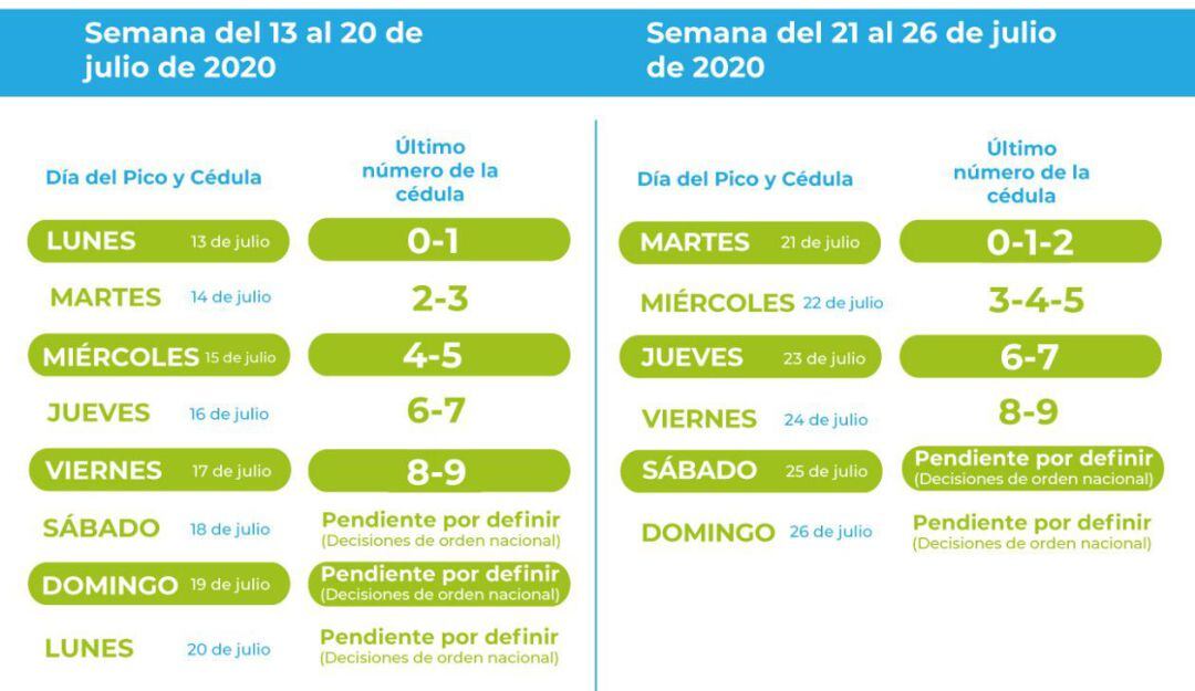 La medida aplicará desde este lunes 13 de julio e irá hasta el viernes 24 de julio. El decreto aclara que, por decisiones de orden nacional, quedan pendientes por definir los números regirán para los días: sábado 18 de julio, domingo 19, lunes 20, sábado 25 y domingo 26 de julio.