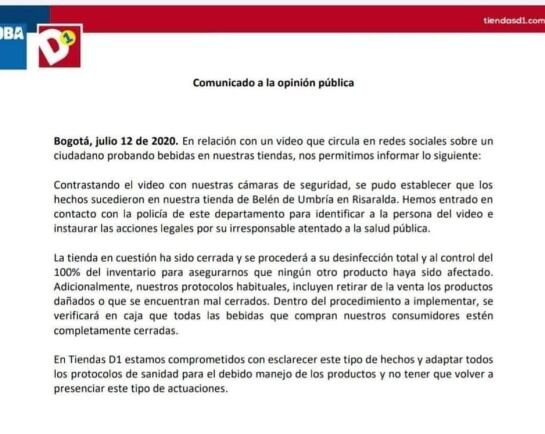 Aunque de manera inicial, se aseguró que el hecho se había presentado en una localidad de Antioquia, mediante un comunicado, las directivas de las tiendas de Cadena, confirmaron que este caso se presentó en el municipio de Belén de Umbría en Risaralda, generando el cierre provisional del establecimiento, para realizar la desinfección total y verificar que el ciudadano no haya cometido ninguna otra conducta indebida que pudiese poner en riesgo la salud e integridad de los usuarios.