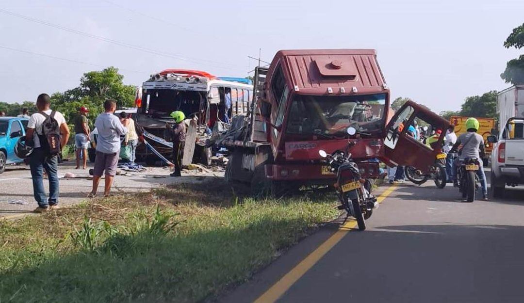 Un aparatoso accidente de tránsito se registró a la entrada del corregimiento de Bayunca entre una buseta de servicio público y un camión cargado de bultos de cemento.