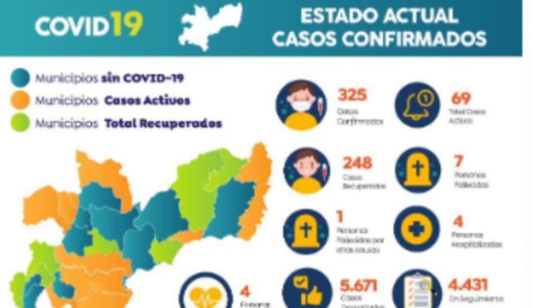 Además, el departamento ajusta 325 ciudadanos infectados, de los cuales 248 se han recuperado, cuatro se encuentran hospitalizados, otros cuatro están en Unidad de Cuidados Intensivos y un total de siete han muerto a causa del virus.