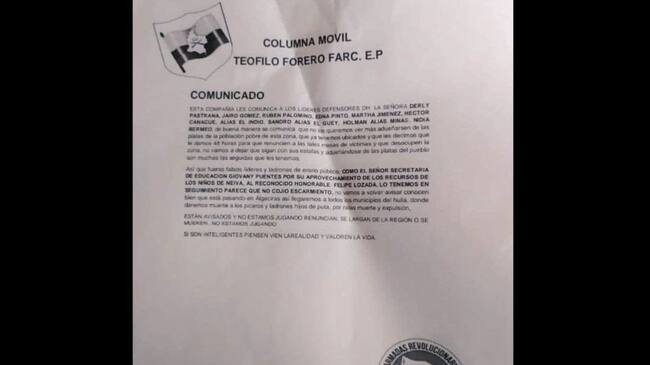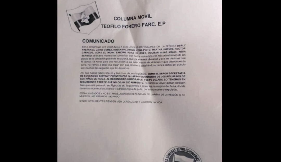 En horas de la mañana de este sábado inició a correr por las redes sociales un panfleto al parecer enviado por la Teófilo Forero de las Farc, donde se le informa con nombre propio a once líderes sociales, ex combatientes, el Secretario de Educación de Neiva y el representante huilense Jaime Felipe Losada que tienen 48 horas para renunciar a los cargos que cada uno desempeña y abandonar la región.