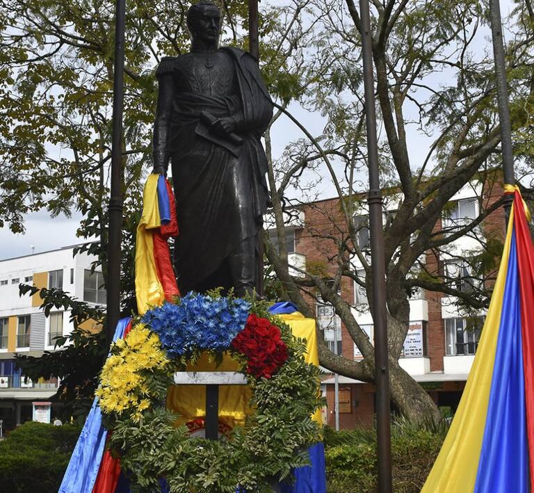Ofrenda floral al monumento a Simón Bolivar en Quimbaya