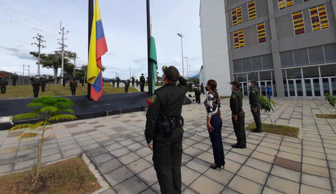 En las instalaciones del complejo Policial Picañela, el coronel Rodolfo Carrero Villamil, comandante departamento de Policía Tolima, junto a otros oficiales y suboficiales izaron el pabellón nacional.