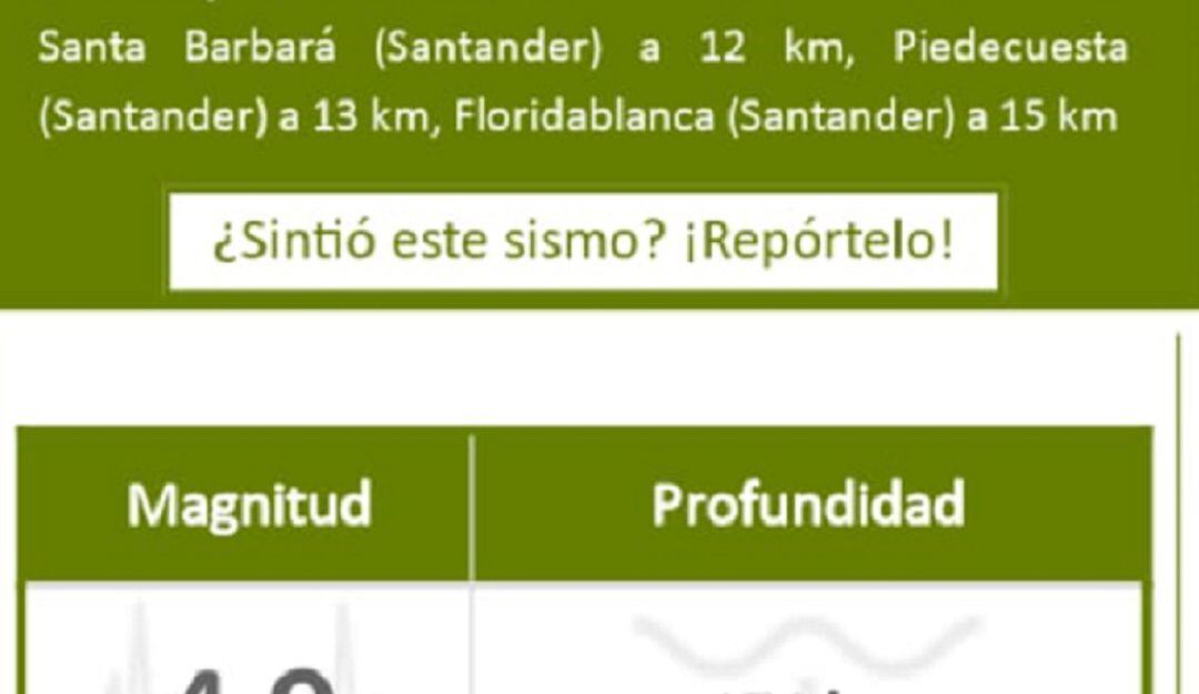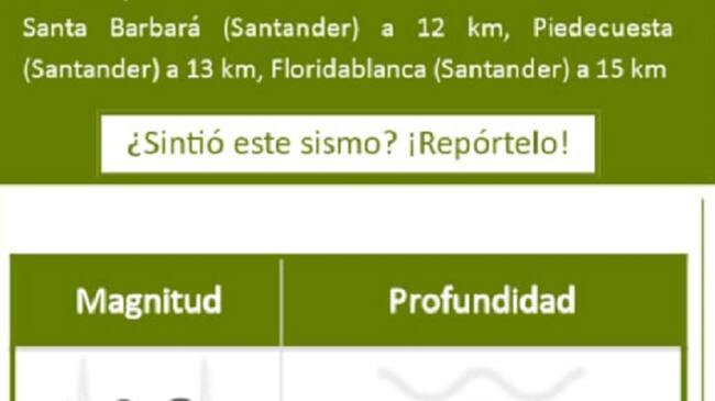 El informe preliminar del Servicio Geológico Colombiano expresa que el sismo ocurrió 4 y 40 minutos de la tarde y tuvo como epicentro el municipio de Piedecuesta, en el área metropolitana de Bucaramanga.
