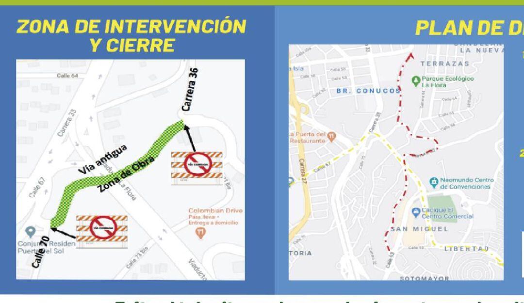 Esto quiere decir que estará cerrada la vía antigua en el tramo que va de la Calle 70, por el conjunto Residencial Puerta del Sol, hasta el empalme con la carrera 36, por la vía principal Parque La Flora.