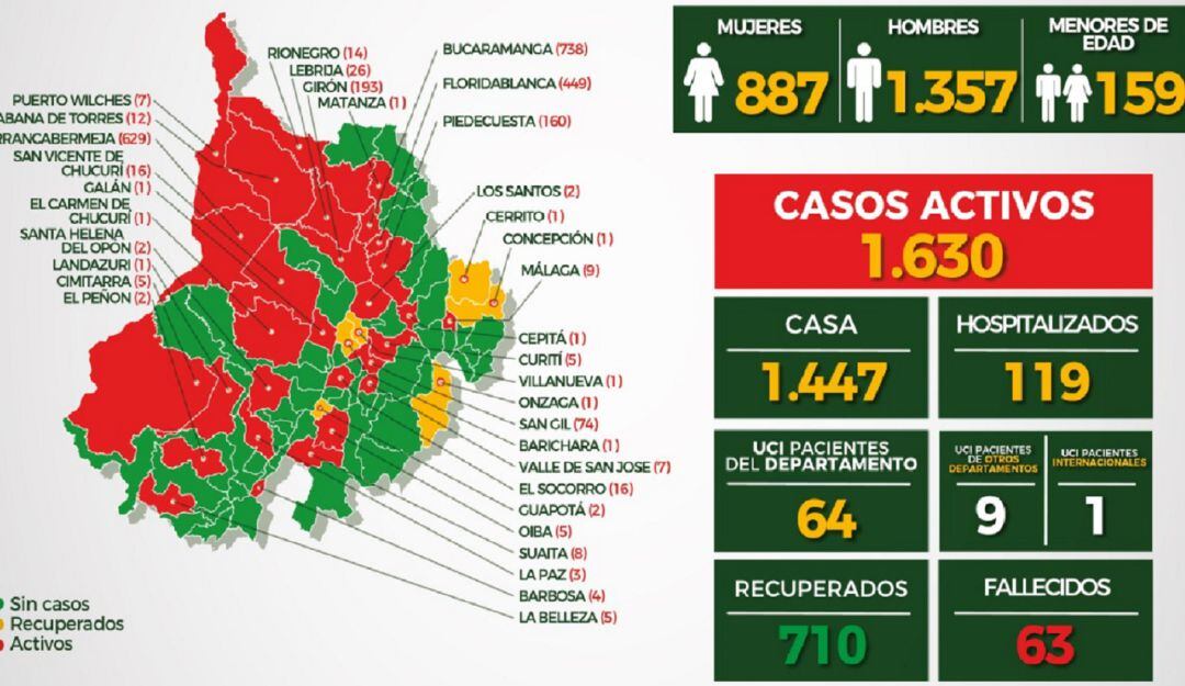 Los pacientes recientemente confirmados son de Barbosa (1), Barrancabermeja (14), Bucaramanga (63), Floridablanca (32), Girón (14), Lebrija (4), Los Santos (1), Málaga (1), Matanza (1), Piedecuesta (12), Rionegro (1), San Gil (3) y San Valle de San José (3).