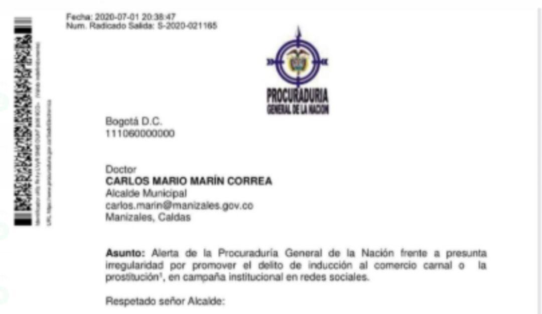 La Procuraduría General de la Nación realiza una alerta al alcalde de Manizales Carlos Mario Marín y a la Secretaría de la Mujer y Equidad de Género por una presunta irregularidad en la que se estaría promoviendo el delito de inducción al comercio carnal o a la prostitución a través de una campaña lanzada por las redes sociales de la Alcaldía, con apoyo del Sena y Fenalco, en la cual se busca que las trabajadoras sexuales puedan continuar con su labor en el tiempo de pandemia por medio de las webcam.