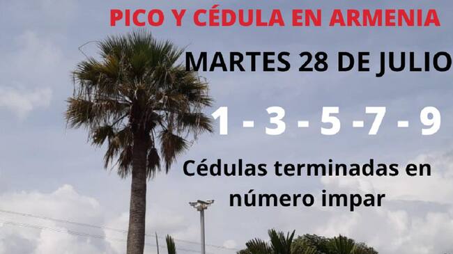 Hoy martes 28 de julio del año 2020, el pico y cédula en la capital Quindiana es para los números de cédula terminados en número impar, es decir 1-3-5-7-9. Con esta medida, se espera que no se presenten aglomeraciones y más contagios de Covid-19, por esta razón solo debe salir una persona por familia.