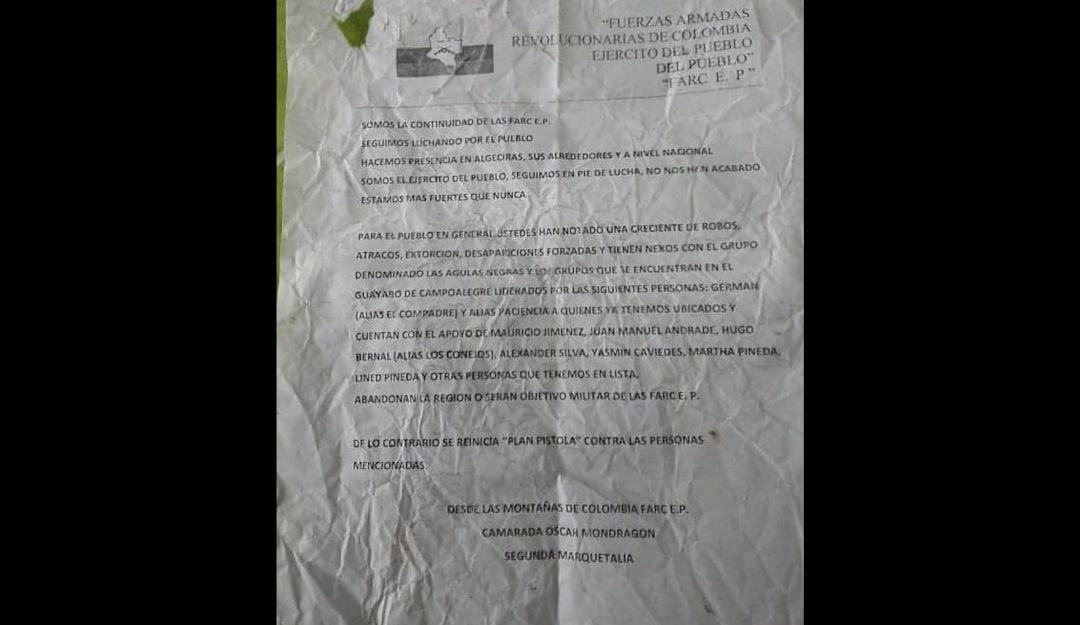 Un nuevo panfleto amenazante en Algeciras Huila enciende las alarmas frente al número de desplazamientos.