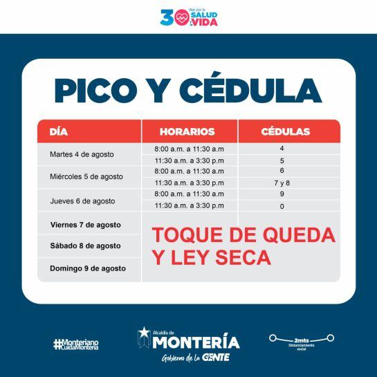 En el comienzo de la semana se impusieron 101 comparendos por violar la medida de pico y cédula en la capital de Córdoba. Así las cosas, elpico y cédula se divide en dos jornadas, así: de 8:00 a.m. a 11:30 a.m. y de 11:30 a.m. a 3:30 p.m.