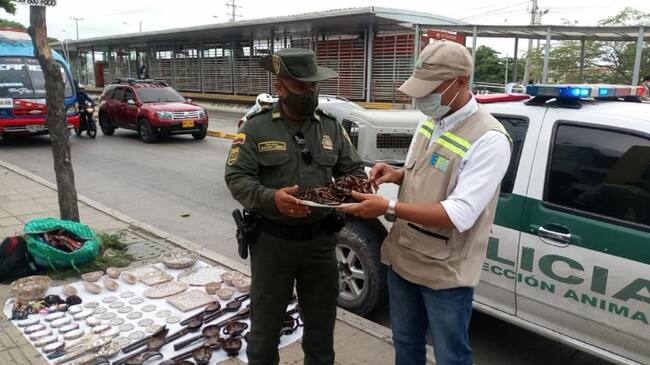Esta incautación se logró cerca al centro comercial Los Ejecutivos, y dichas piezas provenian de una zona del archipiélago de las Islas del Rosario, según confesó uno de los comerciantes, quien fue sancionado con un comparendo por parte de la Policía Metropolitana.