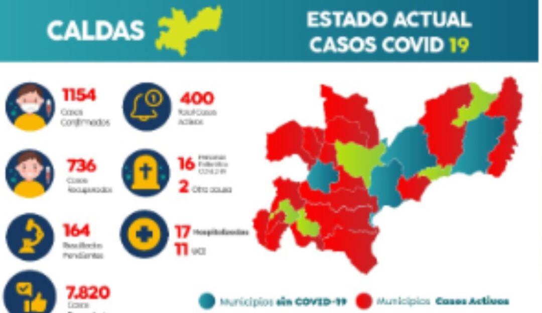 - Manizales: 630 casos confirmados, 240 activos, 382 recuperados y 7 fallecidos.