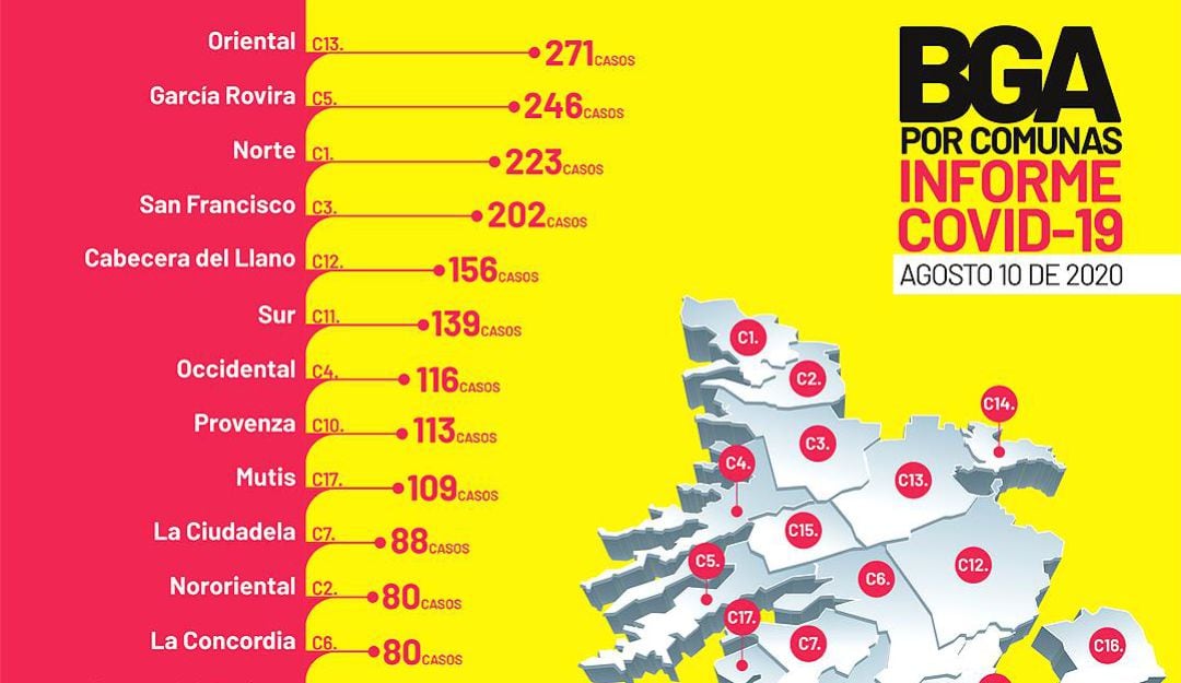 Así están distribuidos los casos de coroanvirus en Bucaramanga, hoy 10 de agosto .