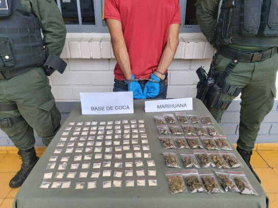En un segundo hecho y tras recibir información de la Red de Participación Ciudadana, logran ubicar a un hombre de 30 años de nacionalidad venezolana, quien transportaba 240 dosis de marihuana y 600 dosis de bazuco, todo esto distribuido en dosis y empacado en bolsas plásticas transparentes y dentro de una bolsa negra.