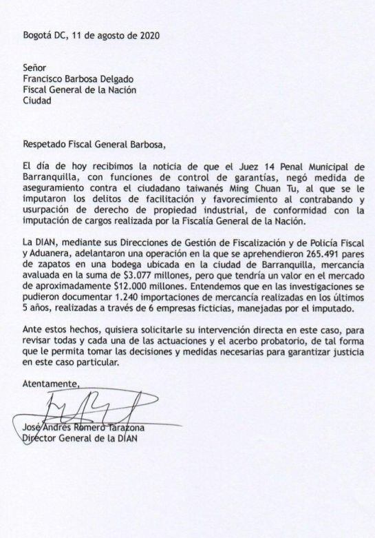 Ante esta decisión de la justicia, el director de la Dian José Andrés Romero, le envió una carta al Fiscal General de la Nación, Francisco Barbosa, para que revise personalmente este caso, teniendo en cuenta que el fiscal encargado señaló al extranjero de los delitos de facilitación y favorecimiento al contrabando y usurpación de derechos de propiedad industrial, durante las audiencias de imputación de cargos.