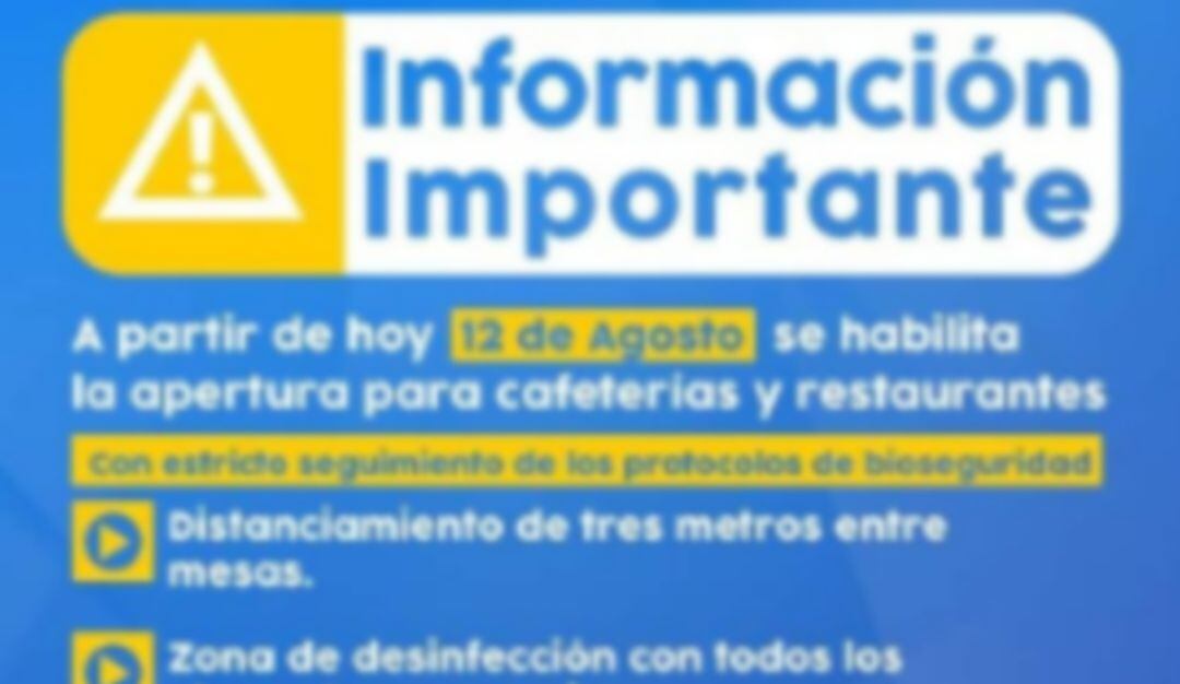 Los requisitos tomados por la Alcaldía para llevar a cabo tal actividad son que los sitios deben implementar protocolos que faciliten el distanciamiento de 3 metros entre las mesas del lugar, que existan zonas de desinfección con todos los elementos necesarios, que solo estén autorizadas dos personas por mesa, entre otras medidas.